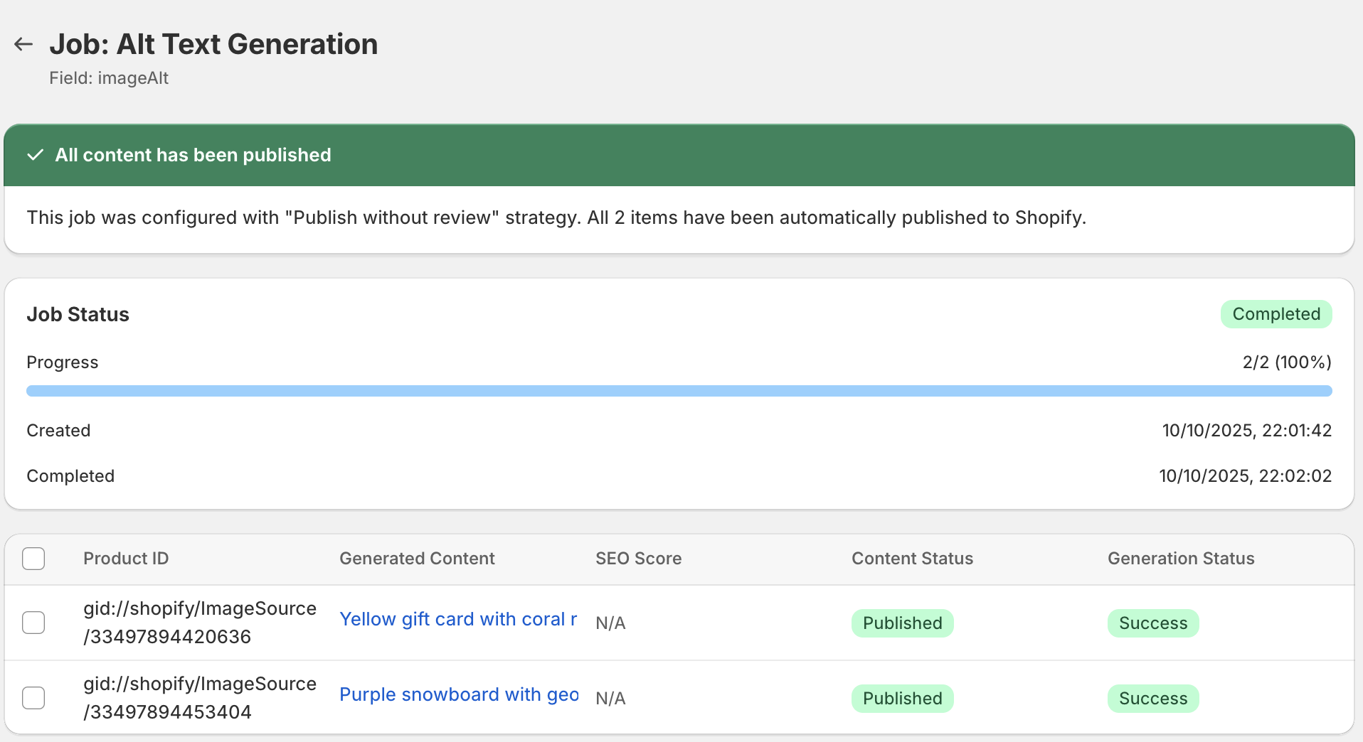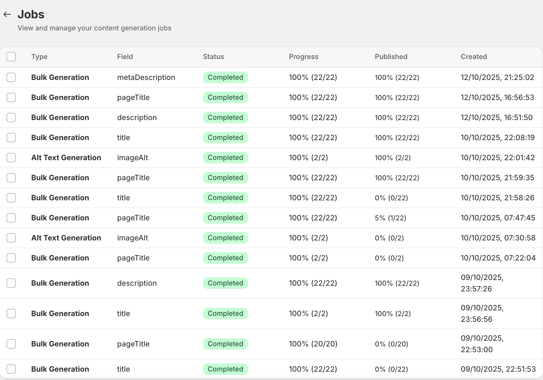 The Jobs system lets you monitor bulk operations, review generated content, and selectively publish results.