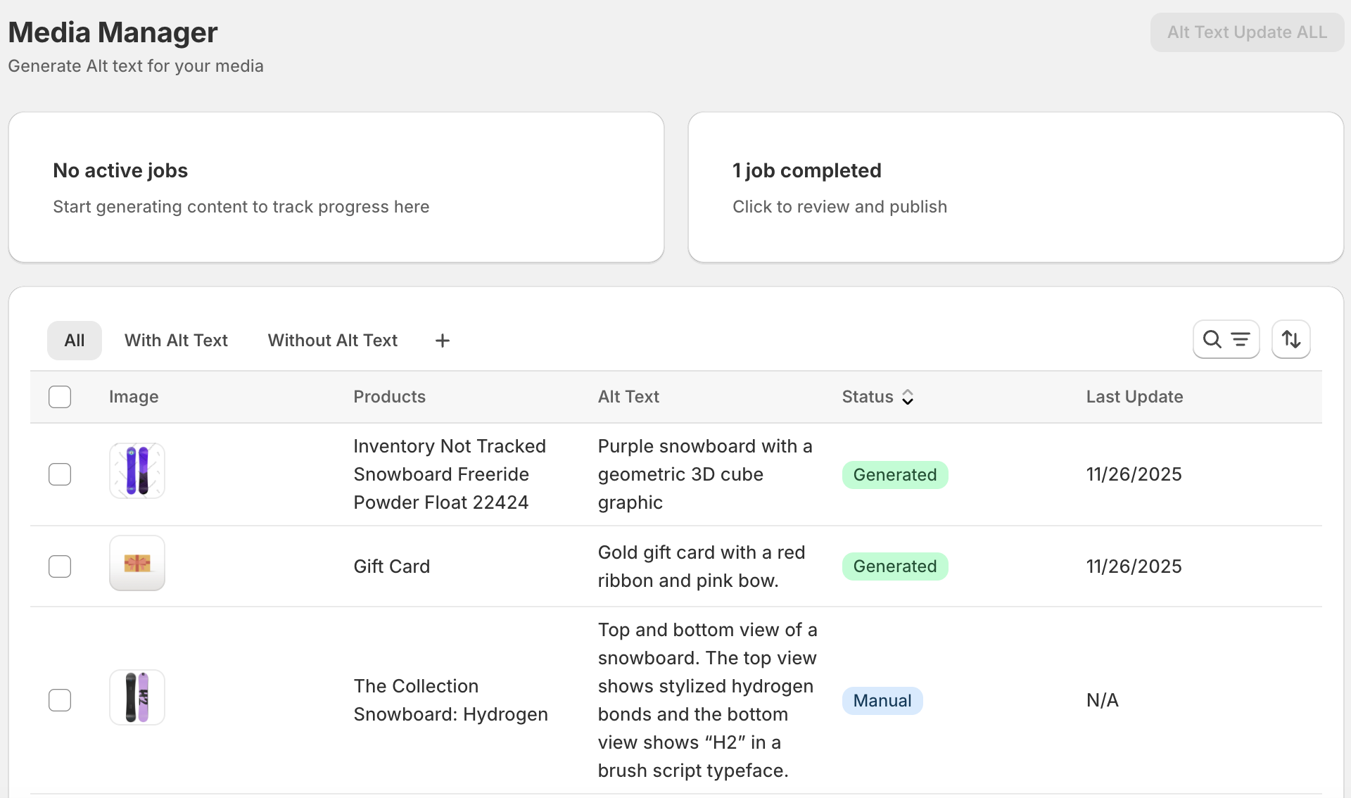 The Media Manager helps you organize product images and generate AI-powered alt text for better SEO and accessibility.
